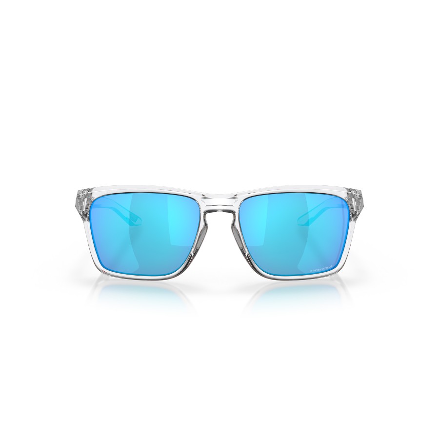 Die Oakley Sylas OO 9448-944804 Sonnenbrille zeichnet sich durch ein klares, rechteckiges Design mit einem durchsichtigen Rahmen aus. Die Gläser sind blau und verspiegelt, bieten UV-Schutz und gehören zur Filterkategorie 3, was sie ideal für helles Sonnenlicht macht.